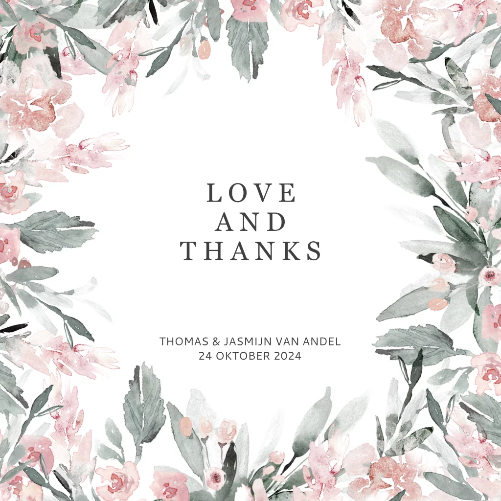 Een romantische bedankkart met bloemen en jullie trouwfoto. Plaats op de achterkant jullie trouwfoto. Een mooie kaart om te versturen naar jullie gasten om ze te bedanken voor hun bijdrage aan jullie bruiloft.