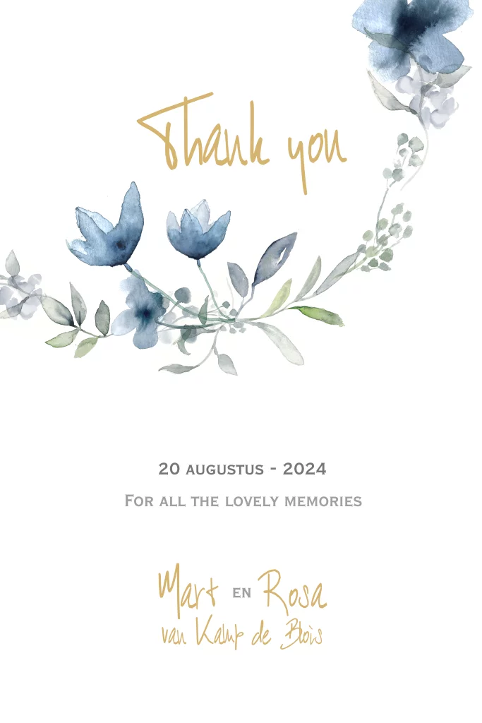Klassiek bedankkaartje met watercolor bloemetjes. Verander de afbeelding voor jullie favoriete afbeelding van jullie bruiloft. De bloemen kunnen niet van kleur verandert worden. Van dit ontwerp hebben we meerdere soorten kaarten.