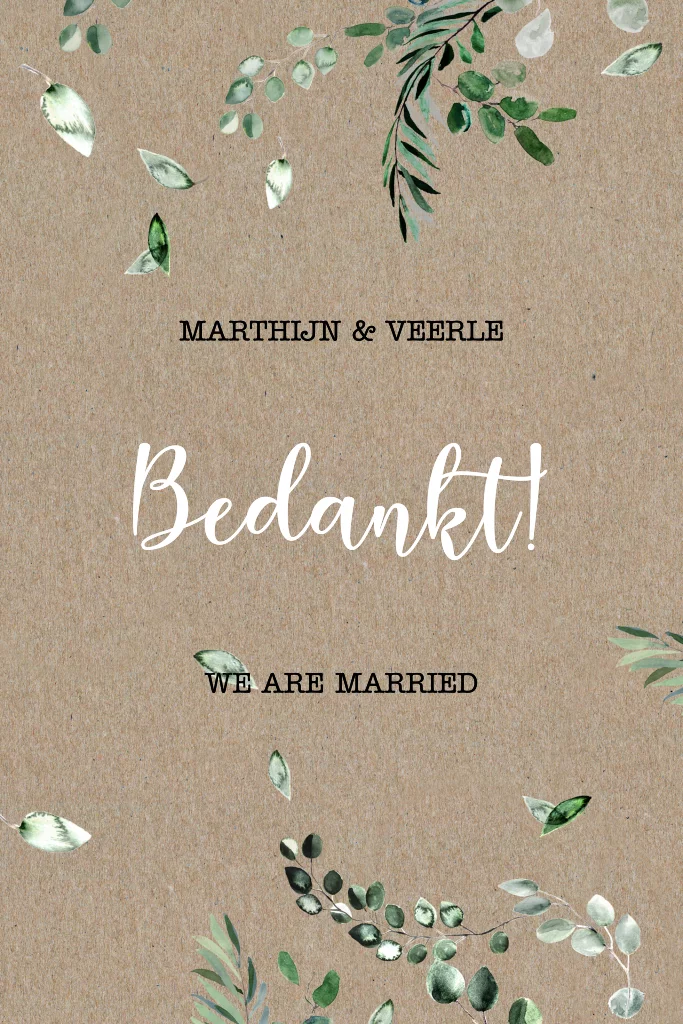 Deze kraft bedankkaart met blaadjes maakt deel uit van een trouwkaartenset.