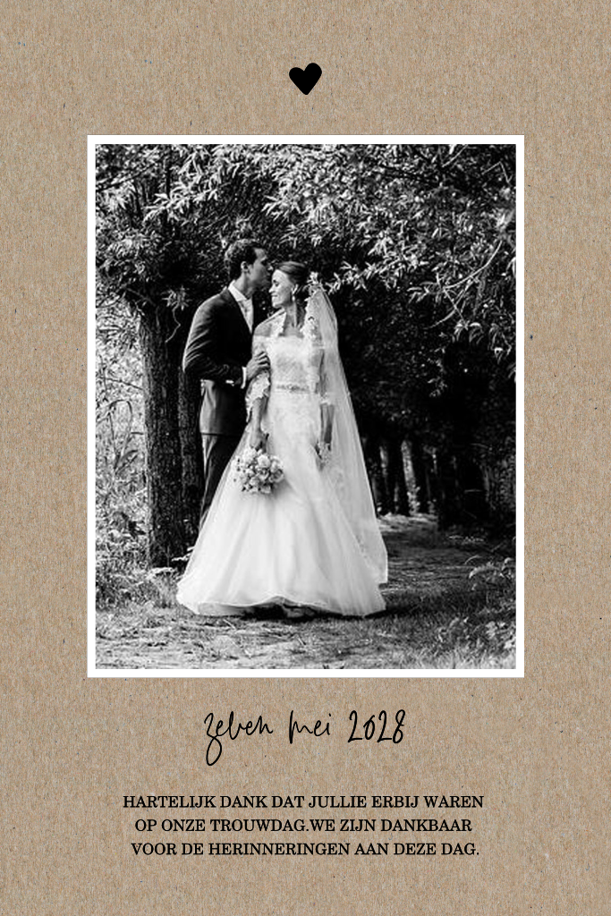 Een origineel kraft bedankkaartje met een hartje. Dit kaartje past bij de trouwkaart in dezelfde stijl. In de editor upload je eenvoudig een persoonlijke foto.