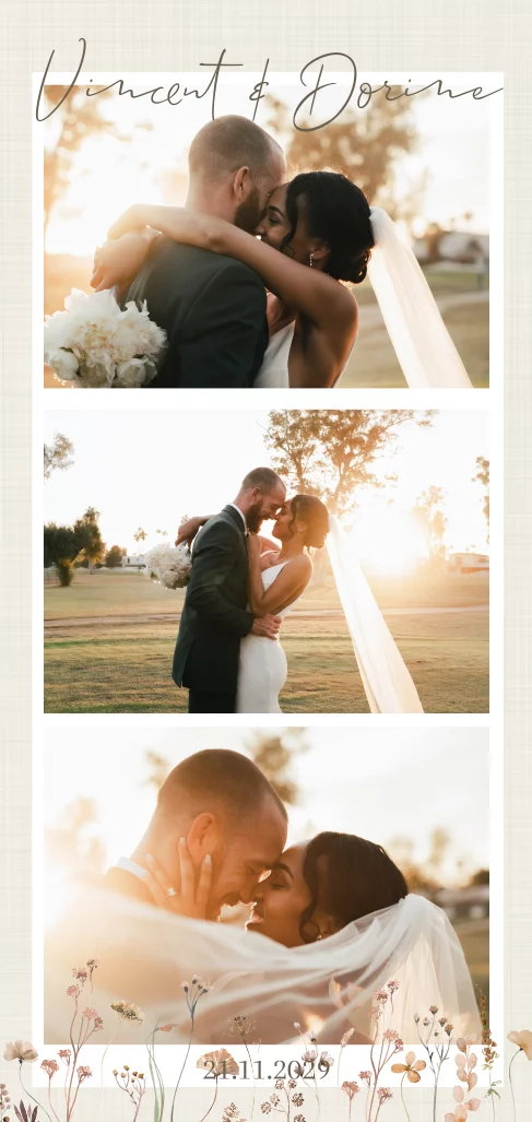 Een bedankkaartje stuur je om gasten te bedanken voor hun aanwezigheid en bijdragen aan de trouwdag. Dit is een bedankkaart met fotocollage met bloemen en een linnenlook.| Totaalprijs: 0 |