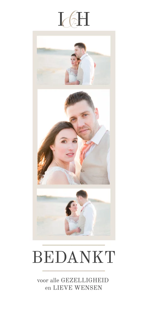 Ontwerp een bedankkaart met de mooiste foto's van jullie trouwdag. Dit is een klassieke bedankkaart voor de bruiloft in witte en beige tinten.