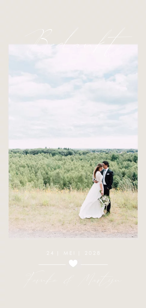 Maak een liefdevolle bedankkaart om de gasten te bedanken voor hun bijdrage aan jullie bruiloft. Ontwerp de bedankaart in dezelfde stijl als je trouwkaart. Je upload eenvoudig een foto in de kaartopmaker. Op de voorkant wordt goudfolie gedrukt.