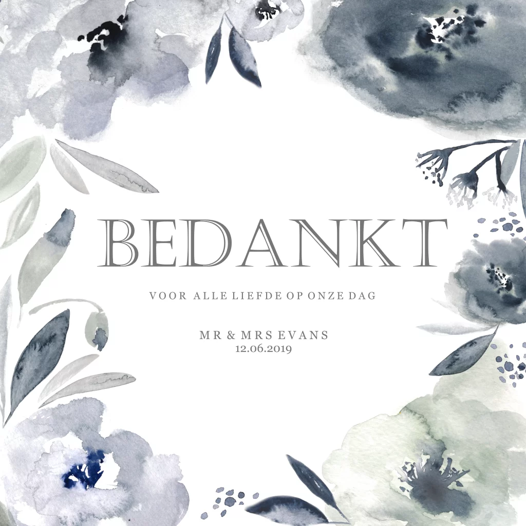 Dit bedankkaartje met geverfde bloemen past mooi in elk seizoen. Plaats jullie mooiste foto in de kaart en laat jullie gasten nagenieten van jullie dag. De kaart hoort in de trouwhuisstijl Blooming Jewels.