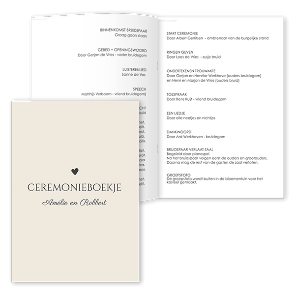 Ontwerp een ceremonieboekje voor tijdens de ceremonie. Hier kan je het programma van jullie ceremonie in opnemen om uit te delen aan gasten. Dit is een ceremonieboekje bruiloft met 4 pagina's. Voeg zelf in de editor het programma van jullie ceremonie toe.