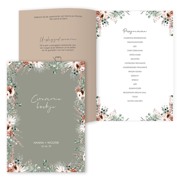 Maak een leuk bohemian boekje voor ceremonie tijdens jullie bruiloft. Dit boekje van 12 pagina's vul je met de programma van de ceremonie. Denk aan de bijdragers, speeches, geloften en muziek. Om dit ceremonieboekje persoonlijk te maken, kan je ook jullie mooiste foto's toevoegen.