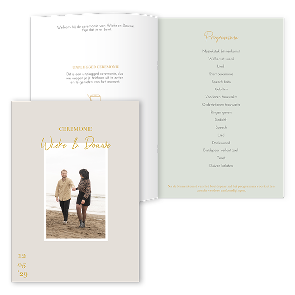 Maak een handig ceremonieboekje voor jullie trouwdag. Dit boekje voor ceremonie vul je met het programma van de plechtigheid. Denk aan muziek, zang, speeches en namen van wie er wat bijdraagt. We hebben dit ceremonieboekje gevuld met een voorbeeldprogramma, deze pas je eenvoudig zelf aan. Je hebt de keuze uit verschillende aantallen pagina’s. Kies eerst hoeveel pagina’s je wilt en ga daarna verder.