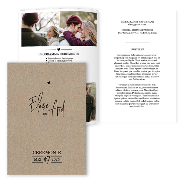 Dit is een ceremonieboekje bruiloft in kraftlook. Je kan dit boekje vullen met informatie over jullie ceremonie. Denk hierbij aan het programma, bijdragers, speeches, muziek. Maak het boekje persoonlijk door leuke feitjes over jullie te delen of foto's toe te voegen.Altijd stijlvol en uniek! Eenvoudig te personaliseren in de editor Proefdruk mogelijk Voor hulp: 085-743 0766