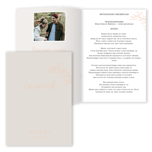 Dit is een stijlvol ceremonieboekje bruiloft met blaadjes in rosékleur. Je kan dit boekje vullen met informatie over jullie ceremonie. Denk hierbij aan het programma, bijdragers, speeches, muziek. Maak het boekje persoonlijk door leuke feitjes over jullie te delen of foto's toe te voegen.Altijd stijlvol en uniek! Eenvoudig te personaliseren in de editor Proefdruk mogelijk Voor hulp: 085-743 0766