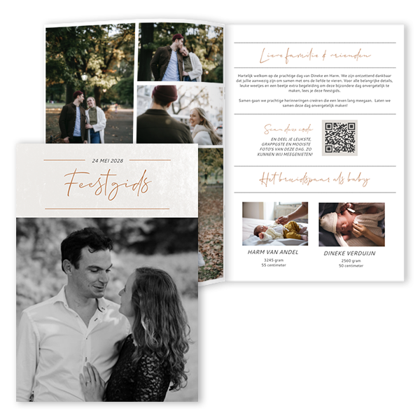 Deze feestgids met foto maakt deel uit van de trouwkaartenset.