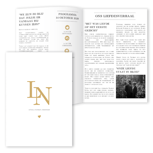 Bestel een feestgids voor jullie bruiloft. Een feestgids is een boekje van 8 pagina's die je vult met leuke en grappige informatie over jullie. Deze kan je laten maken door je ceremoniemeesters, maar je kan het ook zelf maken. Dit is een stijlvolle feestgids met jullie initialen op de voorkant, passend bij een trouwkaart in dezelfde stijl. Deze feestgids is ontworpen voor 8 pagina's. Je hebt de keuze uit verschillende aantallen pagina’s. Kies eerst hoeveel pagina’s je wilt en ga daarna verder.Altijd stijlvol en uniek! Eenvoudig te personaliseren in de editor Proefdruk mogelijk Voor hulp: 085-743 0766