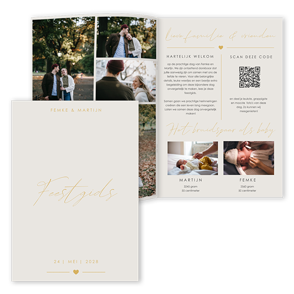 Een feestgids wordt vaak gevuld met puzzels en leuke verhalen over het bruidspaar. Dit is een stijlvolle bruiloft feestgids, passend bij de trouwkaart in dezelfde stijl. De informatie in deze feestgids is ter inspiratie en pas je eenvoudig aan, zo maak je altijd een originele en persoonlijke feestgids. Je hebt de keuze uit verschillende aantallen pagina’s. Kies eerst hoeveel pagina’s je wilt en ga daarna verder.Altijd stijlvol en uniek! Eenvoudig te personaliseren in de editor Proefdruk mogelijk Voor hulp: 085-743 0766
