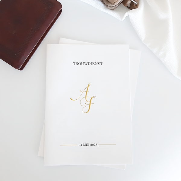 Ontwerp zelf een liturgie passend bij alle drukwerk voor jullie bruiloft. Laat het logo ook weer terugkomen op deze liturgie.