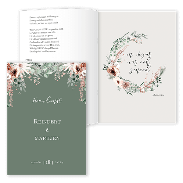 Een liturgie voor tijdens de trouwdienst op de bruiloft. Deze liturgie heeft groene tinten met illustraties van bloemetjes. De inhoud past je eenvoudig aan in de editor. Je hebt de keuze uit verschillende aantallen pagina’s. Kies eerst hoeveel pagina’s je wilt en ga daarna verder.Altijd stijlvol en uniek! Eenvoudig te personaliseren in de editor Proefdruk mogelijk Voor hulp: 085-743 0766