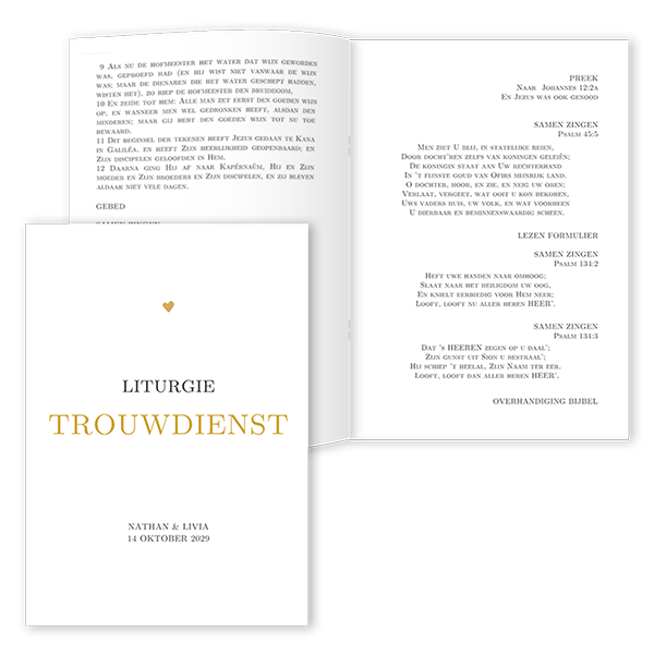 Ontwerp een klassieke bruiloft liturgie met voor jullie trouwdienst. Deze liturgie past bij een trouwkaart in dezelfde stijl.