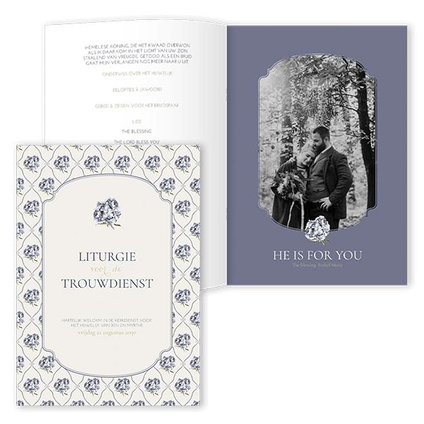 Bestel een liturgie in de stijl van je trouwkaart voor tijdens de trouwdienst. Dit is een vintage liturgie met bloemetjespatroon.Altijd stijlvol en uniek! Eenvoudig te personaliseren in de editor Proefdruk mogelijk Voor hulp: 085-743 0766