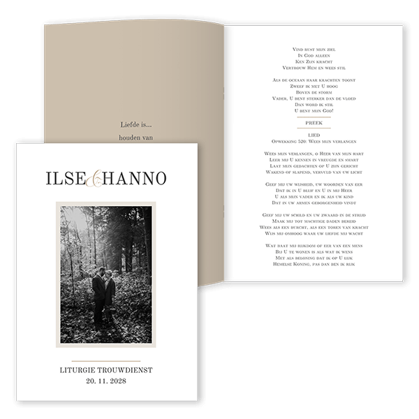 Ontwerp zelf een liturgie passend bij alle drukwerk voor jullie bruiloft. Dit is een klassieke liturgie met een persoonlijke foto.