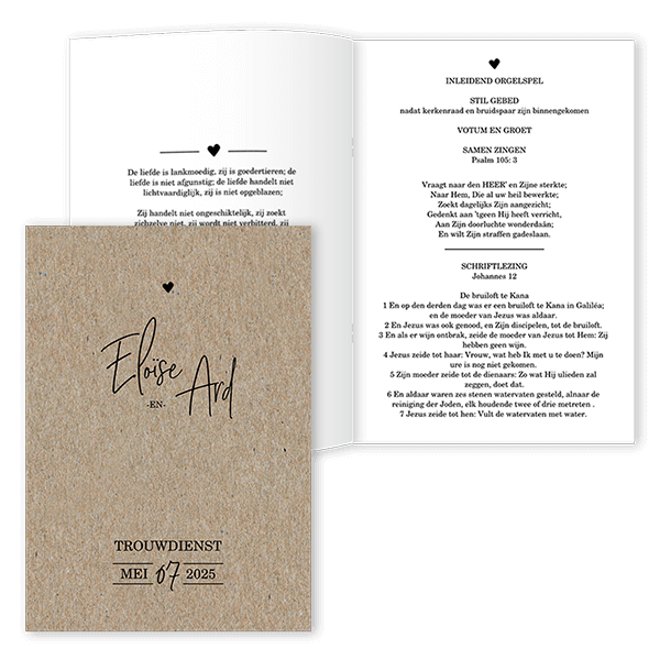 Maak voor de trouwdienst deze liturgie. Op de voorkant wordt een afbeelding van kraftpapier gedrukt. Dit is dus geen kraftpapier, maar heeft wel de mooie kraftlook.