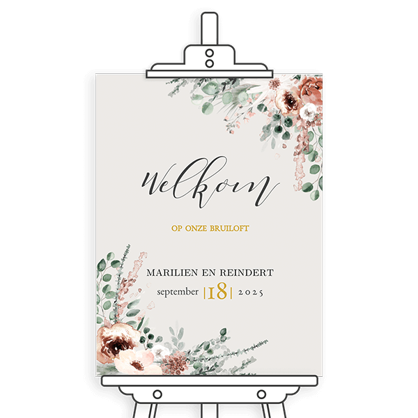Een bohemain welkomstbord met bloemen passend bij de trouwhuisstijl Bohemian Gold. Een welkomstbord is de hartelijkste manier om de gasten welkom te heten op jullie bruiloft.| Totaalprijs: 0 |