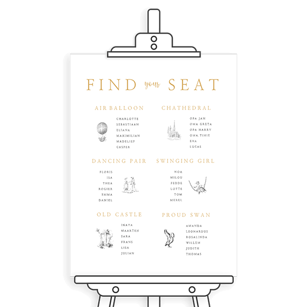 Maken jullie een tafelschikking voor het bruiloftsdiner? Bestel dan dit stijlvolle tafelschikkingsbord. Zo weten alle gasten waar ze mogen zitten. Kies per tafel een illustratie die je laat terugkomen op de tafelnummerbordjes.