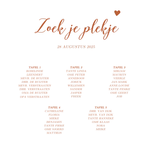 Maak een bord met de tafelschikking voor jullie bruiloft diner. Dit bruiloftsbord wordt gedrukt op het formaat 70 bij 70 cm en is dus goed leesbaar. Een standaard om deze tafelschikking op te zetten mag je zelf regelen.In stijl van jullie trouwdrukwerk Stevig en weerbestendig materiaal Ruime beeldbank met unieke beelden Persoonlijke hulp - 085-743 0766