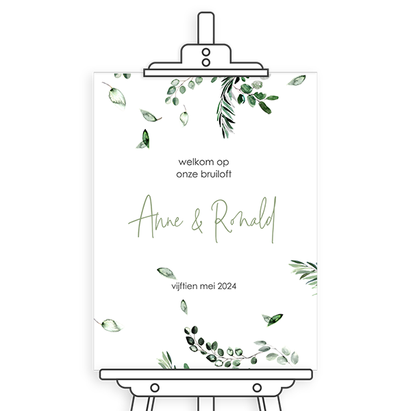 Maak een botanisch welkomstbord voor jullie bruiloft. Teksten kun je in de kaartopmaker aanpassen naar eigen wens.
