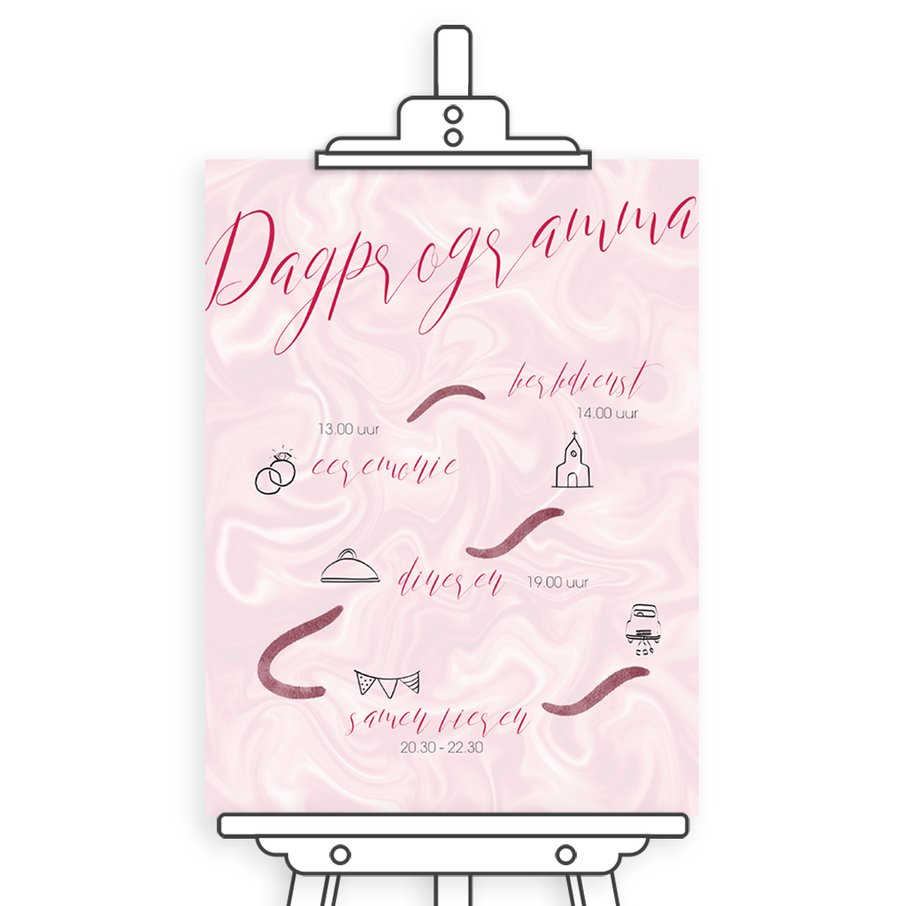 Ontwerp een bruiloftsbord met het programma van de dag. Dit is een hip programmabord in roze kleuren met een tijdlijn van de bruiloft.| Totaalprijs: 0 |