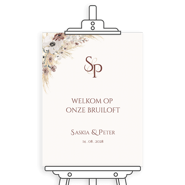 Passend bij de trouwkaart maak je ook een welkomstbord. Laat het logo weer terugkomen op dit welkomstbord.| Totaalprijs: 0 |