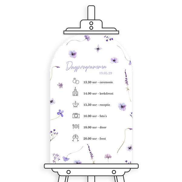 Ontwerp een bruiloftsbord met informatie van de dag. Dit is een bord met paarse bloemetjes en het programma van de dag.Maak het bijpassend bij jouw kaart Personaliseer met zelfgekozen afbeeldingen en teksten Weersbestendig materiaal