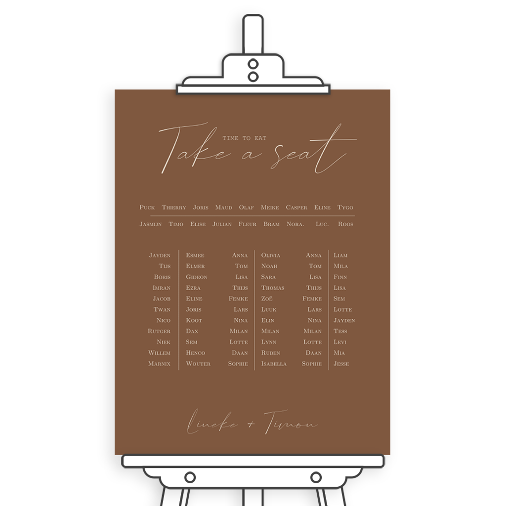 Maken jullie een tafelschikking voor het bruiloftsdiner? Bestel dan dit stijlvolle tafelschikkingsbord. Zo weten alle gasten waar ze mogen zitten.| Totaalprijs: 0 |