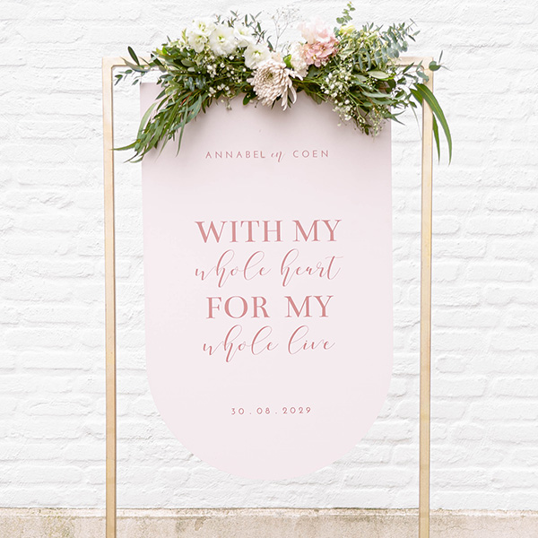 Dit is een origineel bruiloftsbord in boogvorm. Met dit roze bord voor de bruiloft heet je gasten welkom op jullie trouwdag.