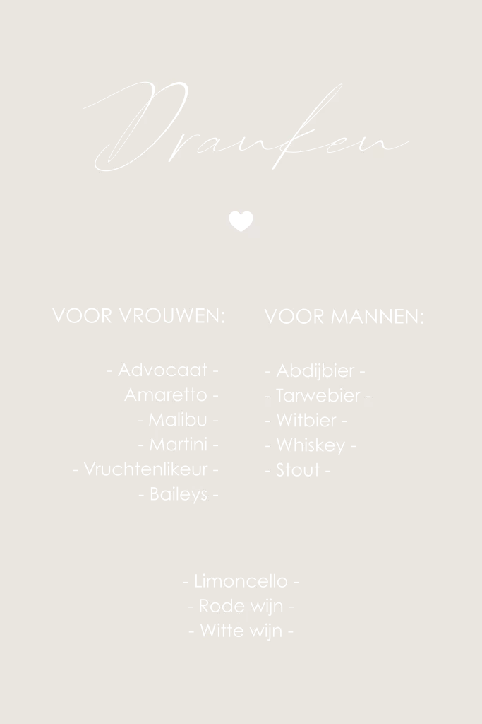 Een informatief bordje met goudfolie voor jullie om de dranken op te vermelden.