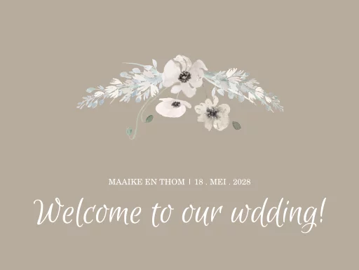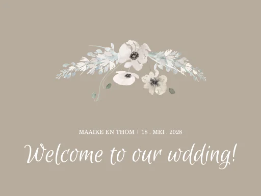 Dit welkomstbord in taupe maakt deel uit van een trouwkaartenset.