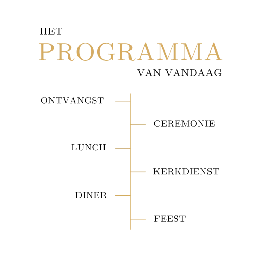 Ontwerp een programmabord voor de bruiloft. Dit is een vierkant informatiebord in klassieke stijl.In stijl van jullie trouwdrukwerk Stevig en weerbestendig materiaal Ruime beeldbank met unieke beelden Persoonlijke hulp - 085-743 0766