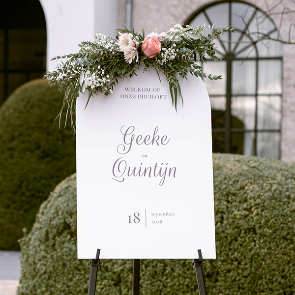 Maak een stijlvol welkomstbord in boogvorm passend bij jullie trouwkaart. Gebruik een ezel of hang dit bord op om jullie gasten welkom te heten op jullie belangrijke dag.