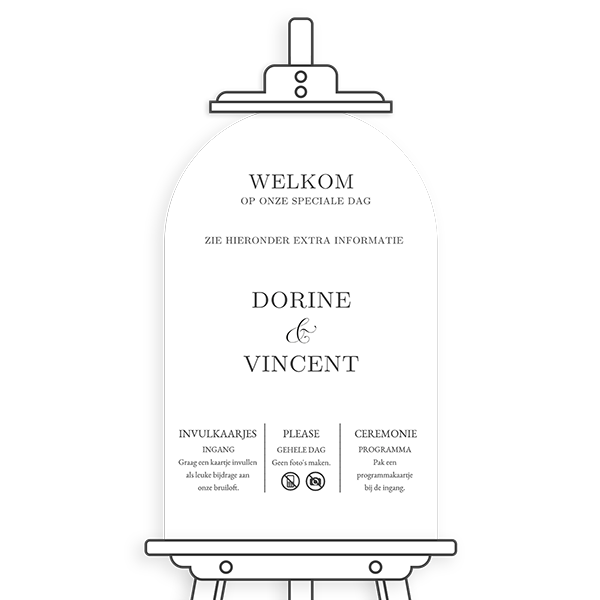 Een stijlvol welkomstbord voor op jullie dag met icoontjes en handige extra informatie. Als jullie nog informatie hebben die jullie aan jullie gasten willen geven, dan is dit bord ideaal. Zou je invulkaartjes of programmakaartjes bij ons willen bestellen? Kijk dan in onze collectie bij meer kaarten.Maak het bijpassend bij jouw kaart Personaliseer met zelfgekozen afbeeldingen en teksten Weersbestendig materiaal