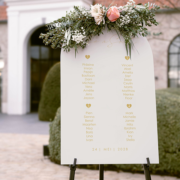 Dé stijlvolle tafelschikking voor bij het diner met teksten in goudkleur en taupe achtergrond. Deze tafelschikking kan ook naar een andere vorm worden omgezet of passend bij jullie trouwkaart gemaakt worden. Als je dat zou willen, neem dan contact met ons op.Maak het bijpassend bij jouw kaart Personaliseer met zelfgekozen afbeeldingen en teksten Weersbestendig materiaal