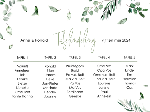 Bestel een bord met de tafelschikking voor jullie diner op de bruiloft. In de kaartopmaker kun je de teksten aanpassen naar het aantal tafel die jullie hebben.