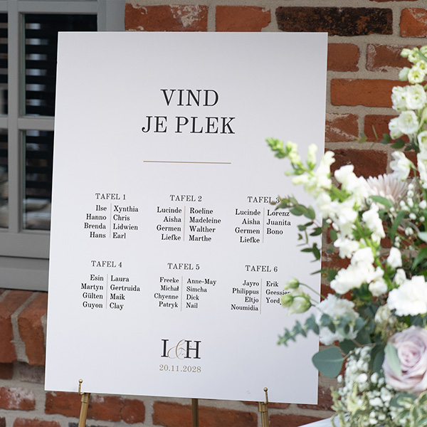Dé klassieke tafelschikking voor je bruiloft in witte tinten met jullie logo. Zo kan iedereen z'n plekje vinden tijdens het diner.