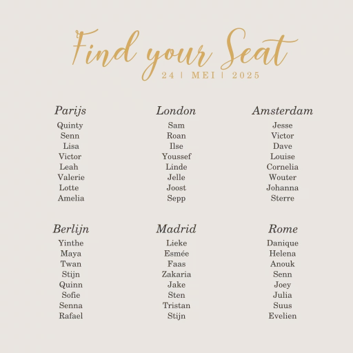 Bij onze trouwkaartenset Classic Dream past deze klassieke tafelschikking. We hebben leuke namen van steden als tafelnummers gezet. Dit is ter inspiratie en kun je naar eigen wens aanpassen.