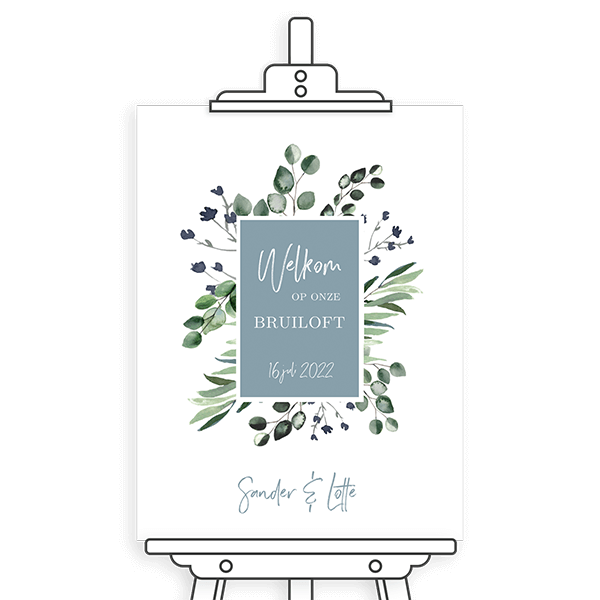 Maak een blauw welkomstbord met blaadjes voor jullie bruiloft. Liever een ander kleur vlak? In de kaartopmaker kun je dit aanpassen.| Totaalprijs: 0 |