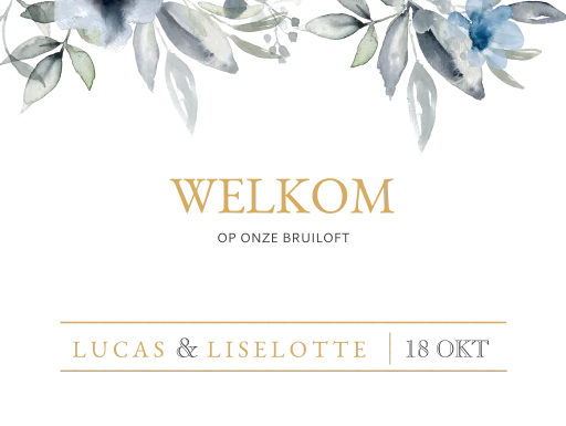 Passend bij de trouwhuisstijl Magnificent Blue kun je je eigen welkomstbord maken! Een welkomstbord is de hartelijkste manier om de gasten welkom te heten op jullie bruiloft.Totaalprijs: 0 |