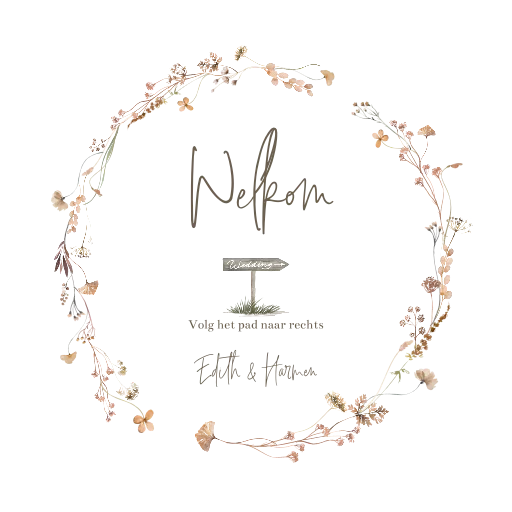 Een welkomstbord is de hartelijkste manier om de gasten welkom te heten op jullie bruiloft. Dit is een vierkant bord met een bloemenkrans van taupe bloemen. In de editor pas je eenvoudig de teksten aan, zodat je een persoonlijk welkomstbord maakt.