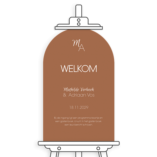 Bestel in dezelfde stijl als de trouwkaart, een bijpassend welkomstbord. Laat jullie logo met initialen ook terug komen op dit bord.Maak het bijpassend bij jouw kaart Personaliseer met zelfgekozen afbeeldingen en teksten Weersbestendig materiaal