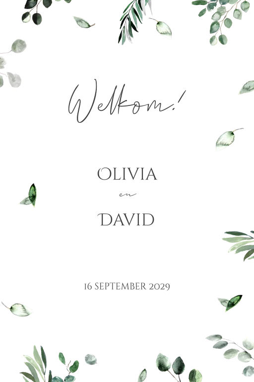 Ontwerp een botanisch welkomstbord voor op je bruiloft met eucalyptus blaadjes. De teksten kan je naar wens aanpassen in de editor.Totaalprijs: 0 |