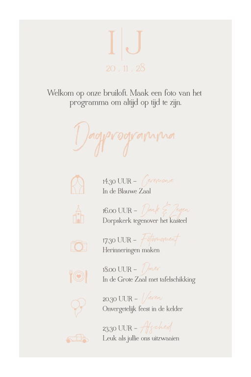 Ontwerp een bruiloftsbord om gasten welkom te heten op je trouwerij. Op dit bord vermeldt je eveneens het programma van jullie trouwdag. Je kan gebruik maken van de icoontjes in de beeldbank.