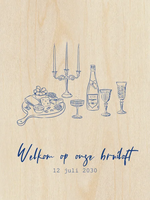 Bestel een leuk houten welkomstbord voor jullie bruiloft. Een welkomstbord zet je aan het begin van jullie bruiloft neer om gasten welkom te heten. Dit is een staand bord met getekende icoontjes.| Totaalprijs: 0 |