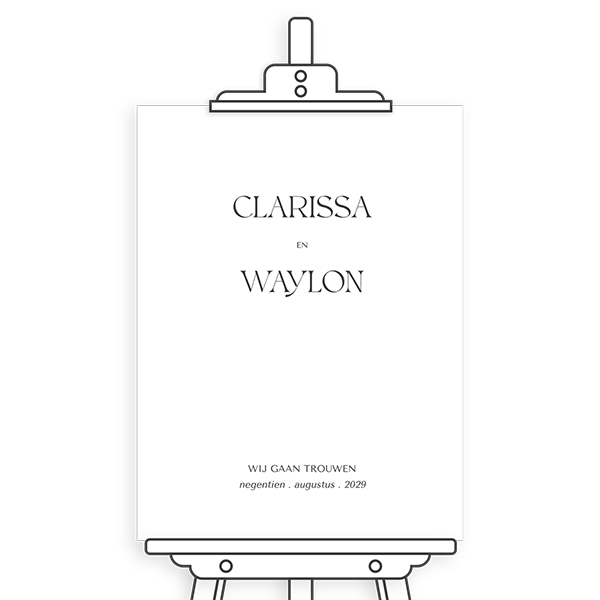 Bestel een modern welkomstbord voor jullie trouwdag. Een welkomstbord bruiloft is een leuke manier om gasten welkom te heten op jullie grote dag.| Totaalprijs: 0 |