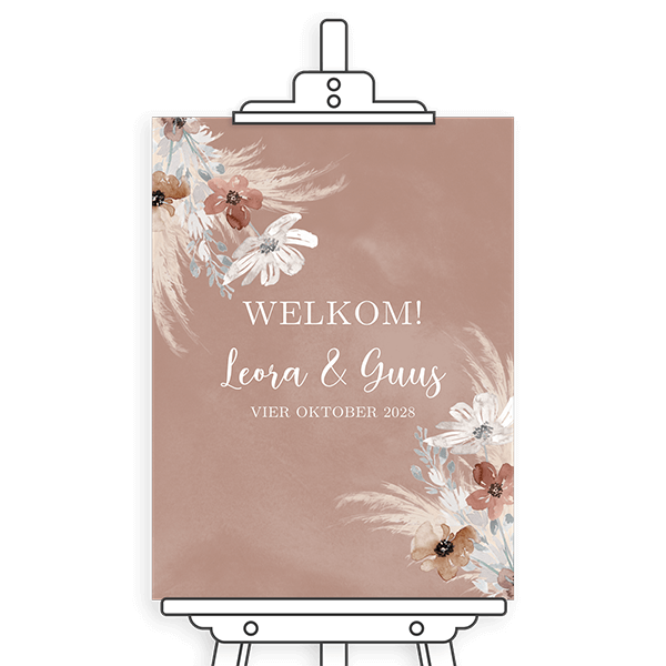 Welkomstbord voor bruiloft in terracotta tinten en pampasgras