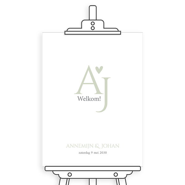 Maak een gepersonaliseerd welkomstbord voor jullie trouwdag. Dit is een trend welkomstbord met logo en een klein hartje. Zet dit bord aan het begin van jullie trouwdag neer om gasten te verwelkomen.| Totaalprijs: 0 |